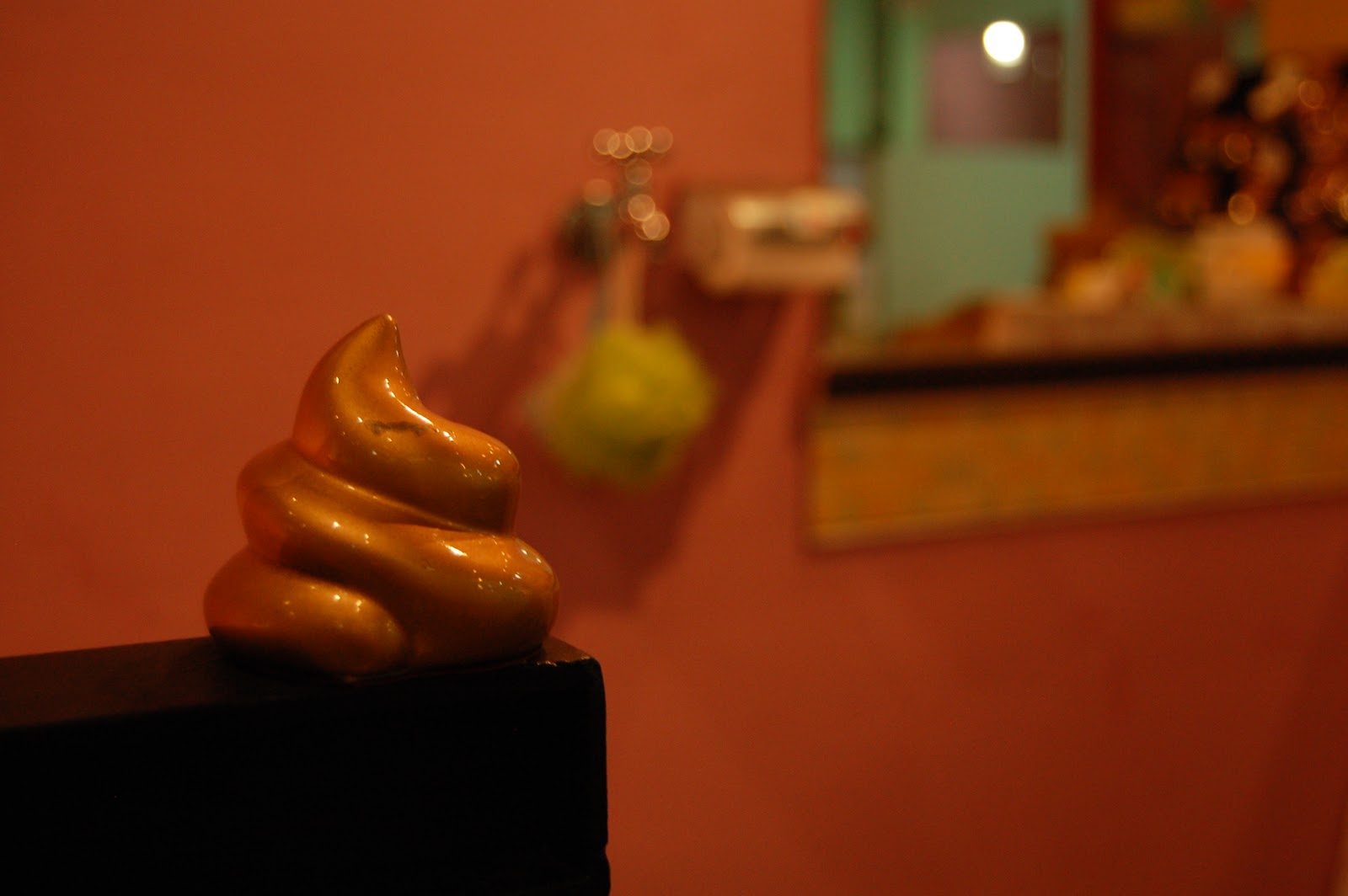 Entering the restaurant, we see rows of toilets with novelty seat covers lining the walls, to be used as chairs. Large sinks with glass tops serve as table, and toilet paper holders on the walls dispense tissue. Everything was toilet or poop themed, from the serving ware (tiny toilet bowls and urinals) to the banister posts on the stairs (tiny golden turds). We order a curry chicken dish, cola, and ice cream desert to share. Each comes served in a decidedly disgusting (or funny?) toilet-themed serving dish. The ice cream, served to resemble a swirl comes in a porcelain squat toilet dish. Classy. The whole meal runs us about 297 Taiwanese dollars, about 12,000 Korean won, or $12.